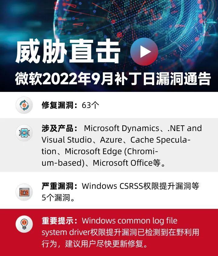 近日,亚信安全CERT监测到微软补丁日发布了63个漏洞的安全补丁,其中5个被评为严重,57个被评为高危,1个被评为中危。远程代码执行(RCE)漏洞占本月修补漏洞的 48.4%,其次是特权提升(EoP)漏洞,占 29%。其中,Windows common log file system driver权限提升漏洞(CVE-2022-37969)已检测到在野利用行为,建议用户尽快安装对应补丁以修复漏洞。