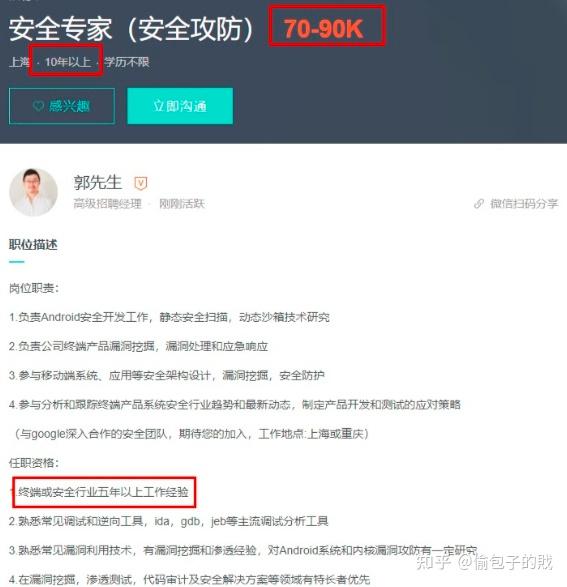 那么安全行业有这个坎吗?我觉得没有,因为安全和之前岗位不一样,年龄大的他经验更丰富,反而比较吃香,尤其很多大厂招聘要求都是5-10年,这没有30、40岁能有10年经验?