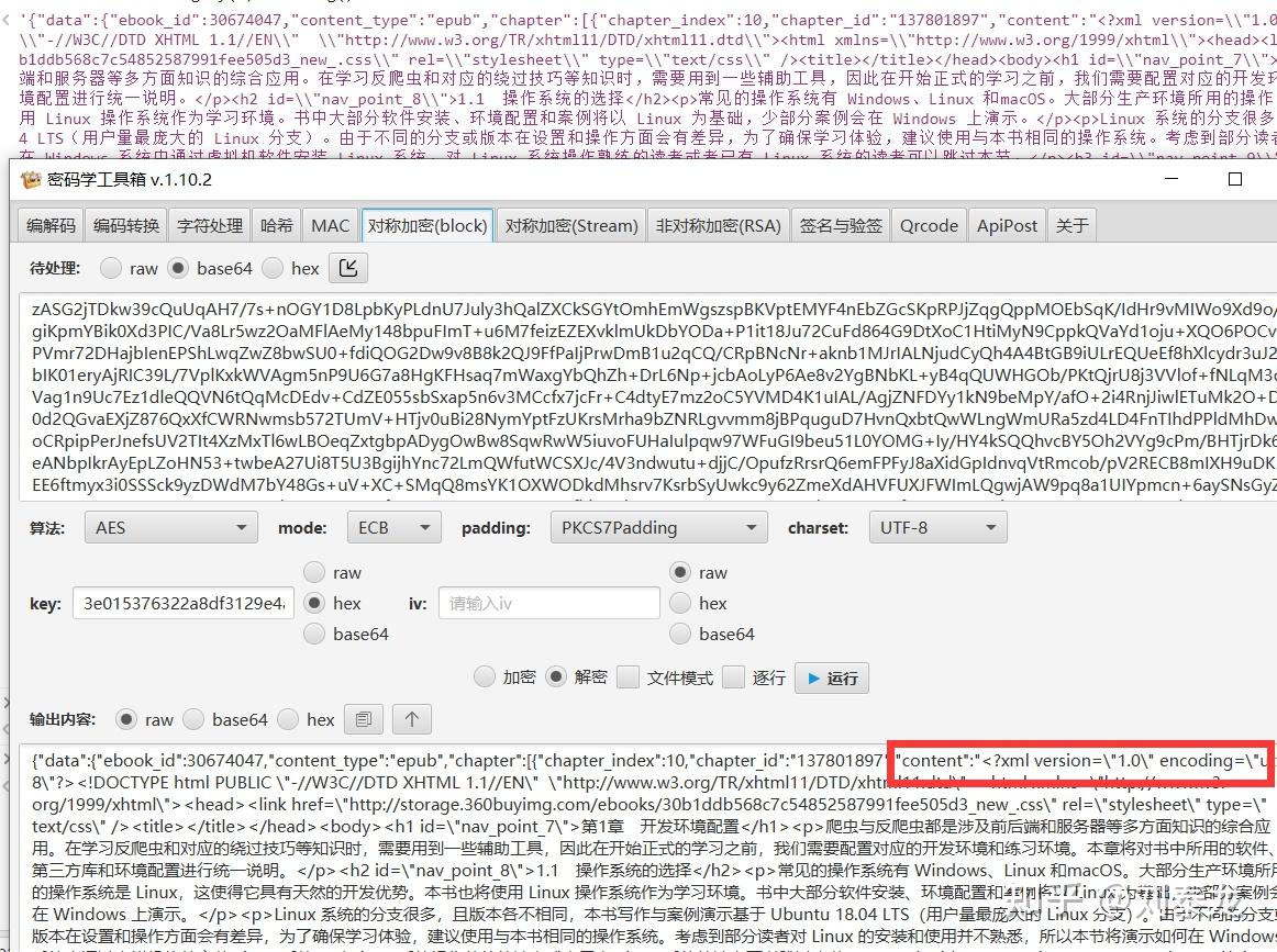 解密后的内容 {"contentList":[{"content":"<?xml version=\"1.0\" encoding=\"utf-8\" standalone=\"no\"?><!DOCTYPE html PUBLIC \****省略***\/html>"}]}很明显content里面的内容就是我们所需要的,具体怎么处理转换成epub就不讲了,我也不会,可以自己了解一下epub格式。