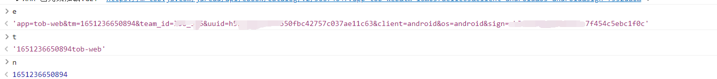 // ./src/utils/common.js然后只剩下sign了,上面已经提到了sign加密函数,就简单看一下,首先是对取(app + time + uuid)的MD5值得到salt,app对应类型tob-web是固定的,time是时间戳,uuid就是上面提到的,为了方便同样把时间写死,然后再对salt + URI + queryString取MD5值,url和queryString自己看图,和前面的进行对比完全一样,到此所有加密参数都基本搞定了
