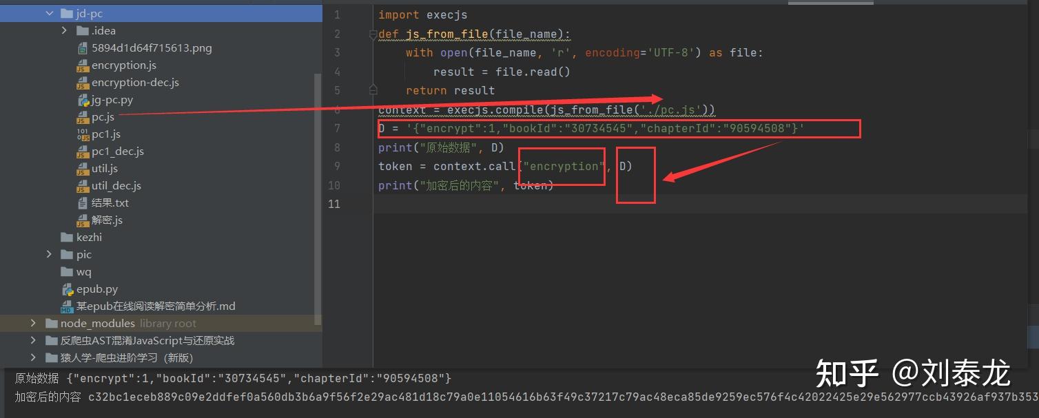 }很明显了下面是写了一个调用上面的函数,看不懂,没关系,只需要知道,加密是函数 encryption同时传入了参数_0x30c8da(从上面可知是{"encrypt":1,"bookId":"30734545","chapterId":"90594508"}),然后干了啥,不需要知道,直接保存下来,用python调用,因为很短,逻辑很清晰可以这样,执行py,网页返回的信息,完全一样,没有问题。