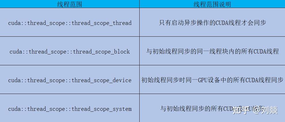 (3)同步对象: 栅栏(cuda::barrier) 或 管道( cuda::pipeline);这些同步对象可以在不同的线程范围中使用。作用域定义了可以使用同步对象与异步操作进行同步的线程集。下表定义了CUDA C++中可用的线程范围,以及可以与每个范围同步的线程。