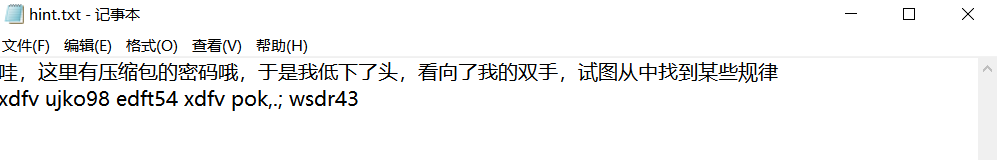 查看附件根据提示知道这是键盘密码,低下头望着手中的键盘若有所思,你会发现每一组用空格隔开的字母串在键盘上连起来都围着一个字母,这时候把五个字母连起来你会得到一个五位数的压缩包密码