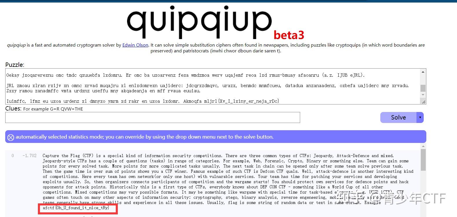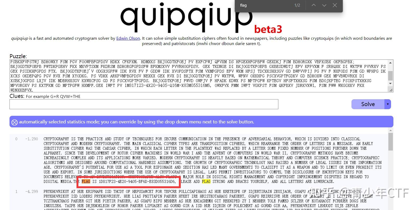 拿到直接丢到quipqiup中分析一下,搜索得到flag
