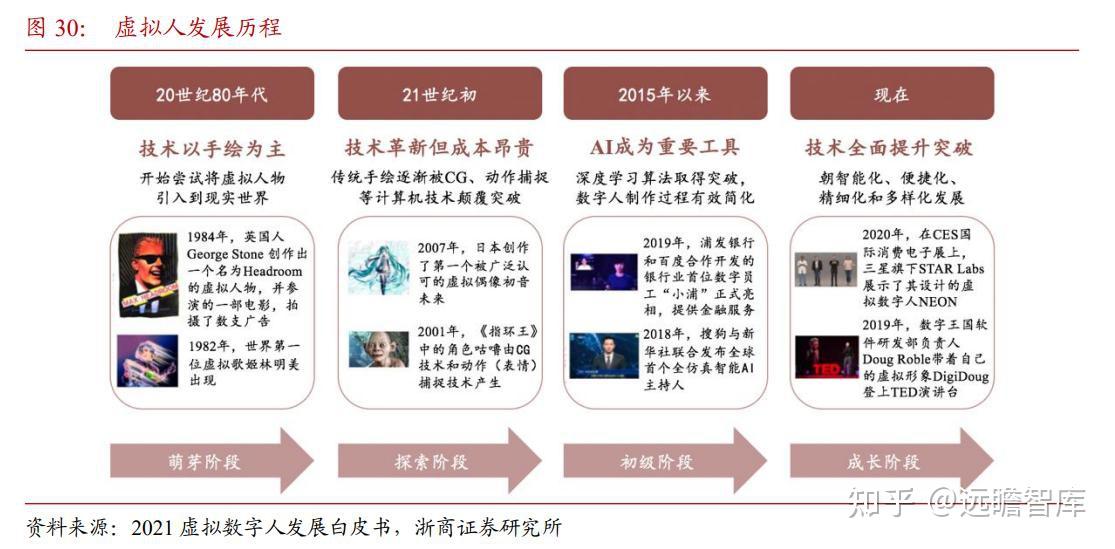 多年沉淀+变现场景丰富,元宇宙将刺激虚拟人行业快速发展。虚拟人概念经过数十年的沉淀和发展,在元宇宙热潮及科技创新中,从虚拟世界逐渐走向并影响物理世界。