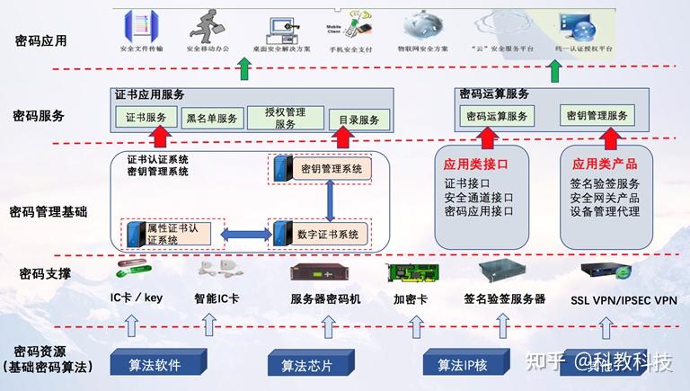 密码支撑层:主要提供密码资源调用,由安全芯片、密码模块、智能IC卡、密码卡、服务器密码机、签名验签服务器、IPSCE/SSL VPN 等商密产品组成。