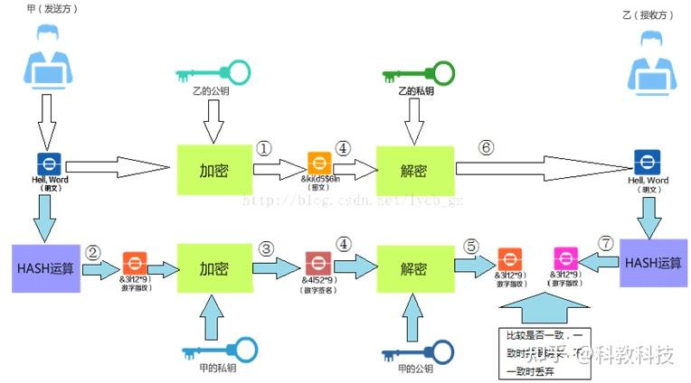 (7)乙使用HASH算法对还原出的明文用与甲所使用的相同HASH算法进行HASH运算,生成数字指纹。然后乙将生成的数字指纹与从甲得到的数字指纹进行比较,如果一致,乙接受明文;如果不一致,乙丢弃明文。