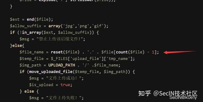这时候呢reset函数取出第一个值是upload20.php 和点拼接 然后count获取长度为2 ,然后2-1为1 但是file数组中没有Key值为1的数字,所以返回为空 所以文件名为upload20.php/ 而$ext获取的是最后面的值因而为jpg也绕过了判断