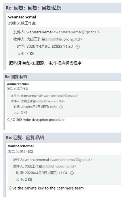 9日上午,一名火绒用户以解密为由,通过邮件尝试联系“WannaRen”勒索病毒作者获取更多信息。该作者在要求火绒用户支付比特币作为赎金未果后,竟主动提供病毒解密钥匙,并要求该火绒用户将密钥转发给火绒团队,制作“相应解密程序”。