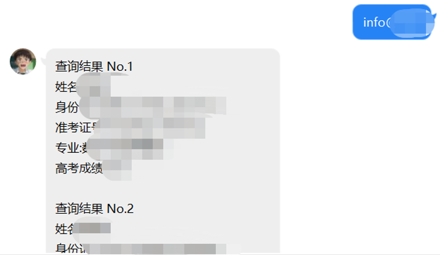 这里为了掩饰危害,自写了爬虫系统爬取了100条(已得到我校老师授权),对接了自己的机器人框架后是可以做社工库的: