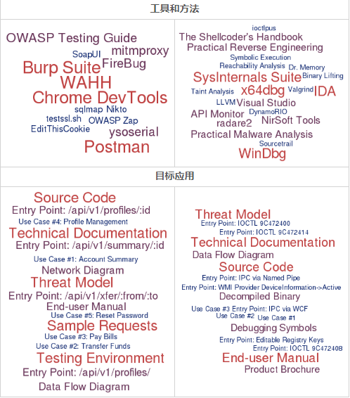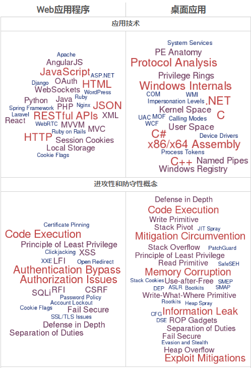 下面这张表格介绍了挖掘web应用程序和桌面应用程序的漏洞时所需要掌握的内容。每个类别中的条目仅用于说明目的,并非详尽无遗。