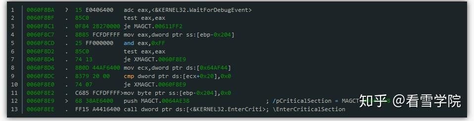 - bp WaitForDebugEvent,shift+F9运行起来,删除断点,然后执行到程序领空,大概停在0060F8BA