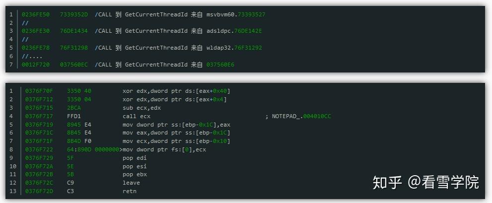 关于第一条,就是上面2.1讲的原则,下面解释第二条。首先对GetCurrentThreadId下断。HE GetCurrentThreadId。查看堆栈窗口,会出现如下结果.中间省略多个,查看关于GetCurrentThreadId都是来自其他模块的调用,但是最后一个是来自程序的调用。这就是程序返回的时机,所以,F8步过,根据之前说的规则,OEP在该程序段最后一个call ecx中。