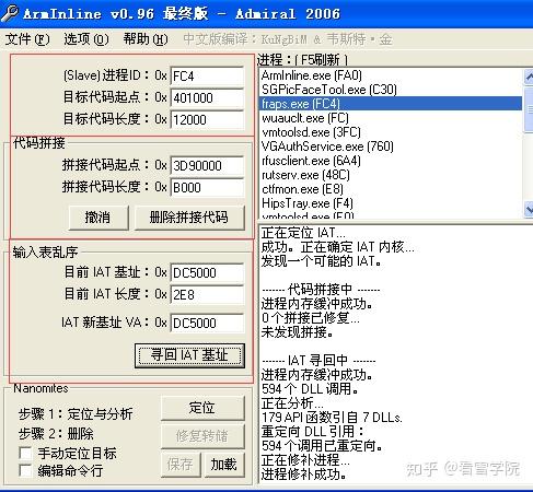 首先祭上大杀器ArmInline,欲要善其事,必先利其器。需要我们填写的就是上述三个区域,不过我这个版本可以自动填写修复的数据,只需要知道我们需要修复的进程,如图,目标进程ID为FC4,选中后依次删除拼接代码和巡回IAT基址。