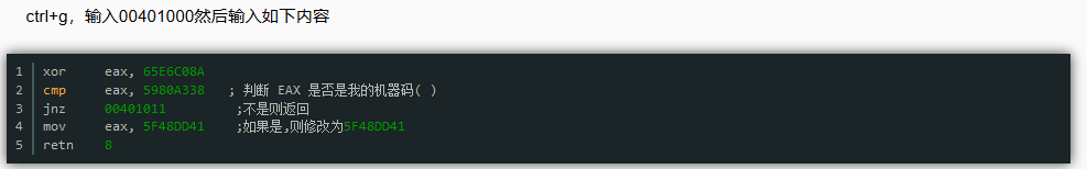 打好补丁后,在401000处F2下下断点,然后返回,剩下的使用上面讲的方法就可以脱去。