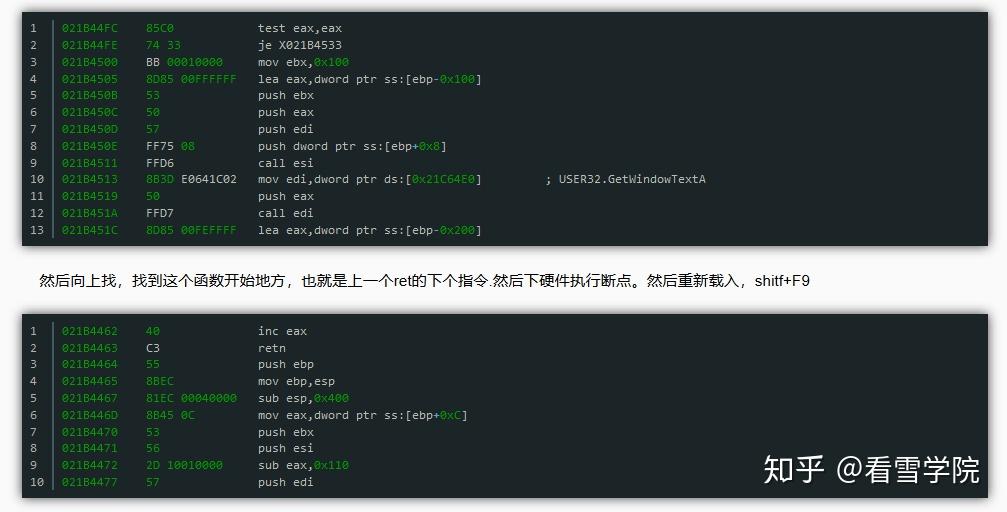 - step1:在GetModuleHandle下硬件断点,可以HE GetModuleHandle或者HE GetModuleHandle+5。