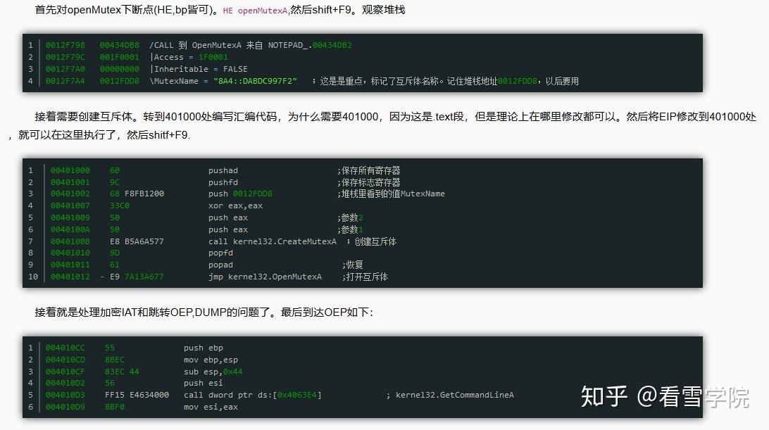 CopyMem-II:双进程保护,最常使用的是bp OpenMutexA,然后转到401000 patch代码。另外一种是修改相反跳转的方法。(脚本方法就是不说了)