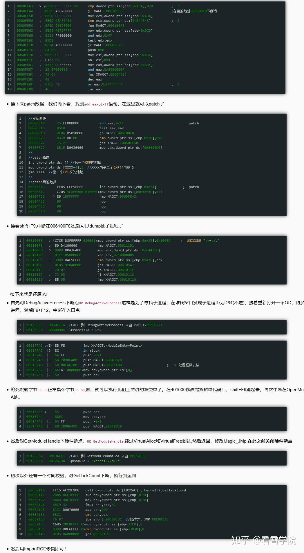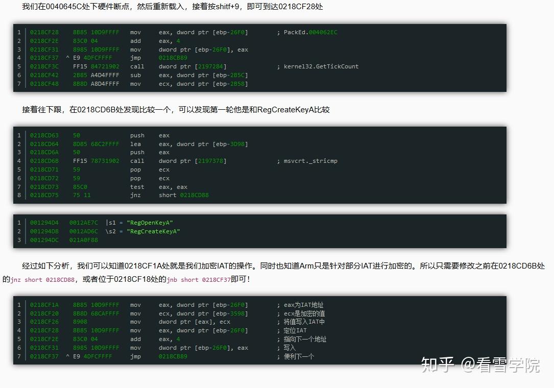 首先须要了解到Arm并不是对所有的API函数进行加密,前辈这里的思路是先直接到达OEP,在根据里面一直的函数地址寻找IAT地址,然后寻找出IAT中被加密的地方,下硬件断点。重新运行之后到达被修改的的地址,然后分析加密IAT的过程,使用jmp或者nop规避即可。