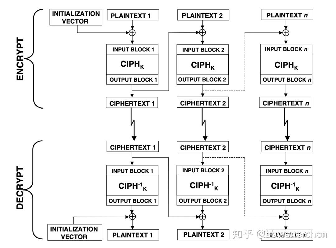 通常,要恢复任何明文块(第一个除外),将逆密码函数应用于相应的密文块,并将结果块与前一个密文块进行异或运算。
