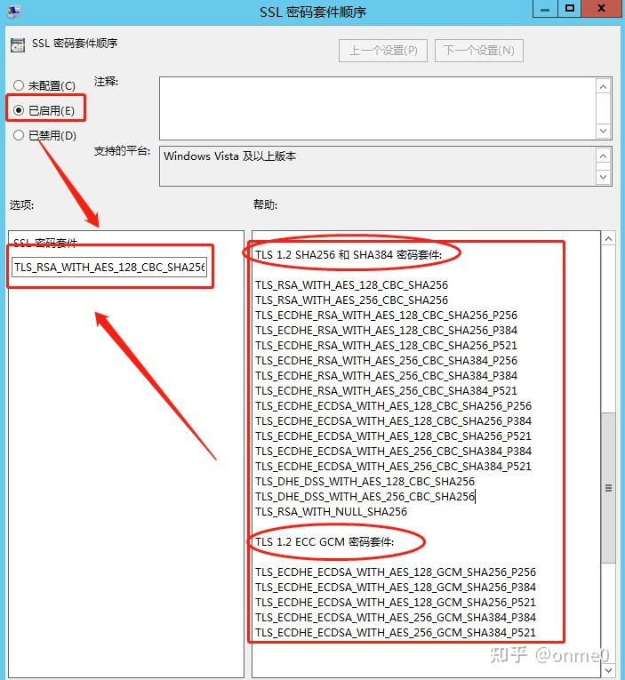设置“已启用”,并且使用TLS 1.2 SHA256 和 SHA384 密码套件和TLS 1.2 ECC GCM 密码套件替代系统默认的SSL密码套件。