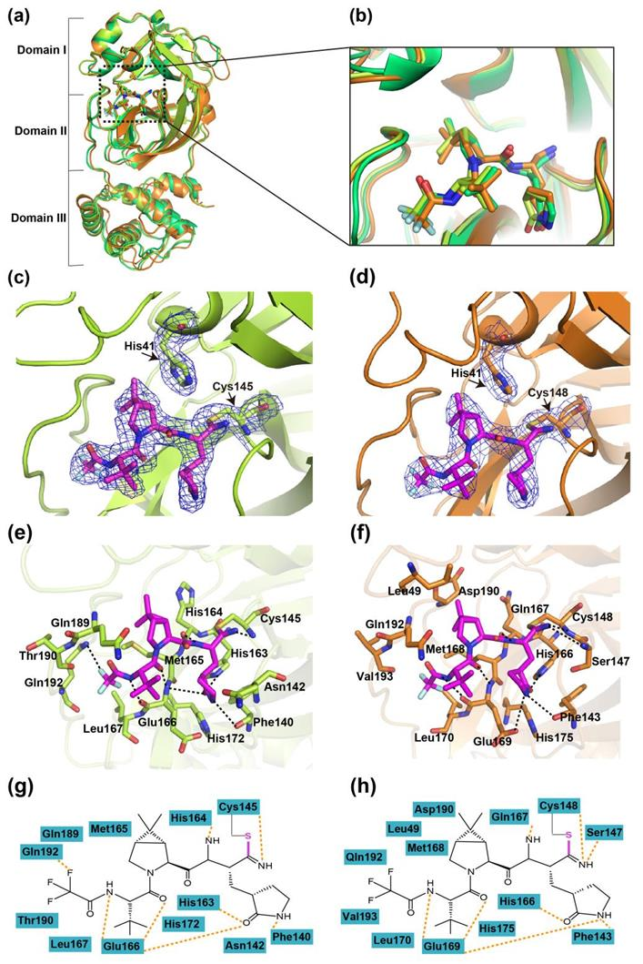 图3 SARS-CoV和MERS-CoV Mpro与PF-07321332复合物的晶体结构