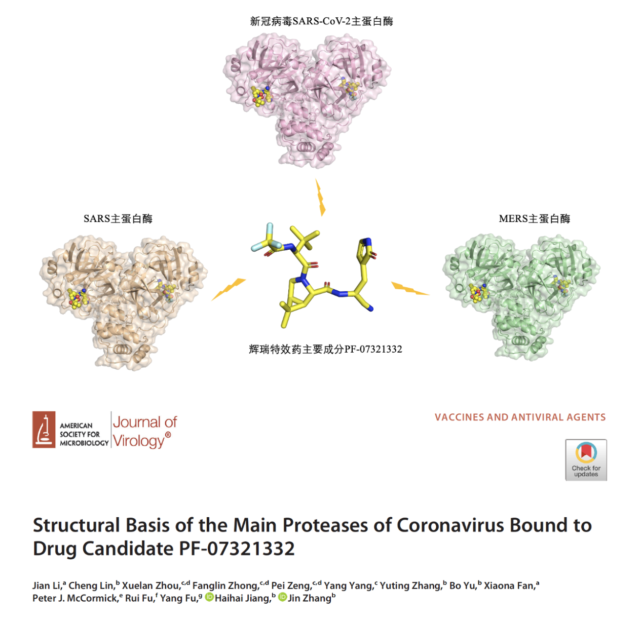 近日,晶蛋生物科学团队在顶尖病毒学期刊《Journal of Virology》上发表了题为”Structural basis of main proteases of coronavirus bound to drug candidate PF-07321332”文章,报道了与辉瑞特效药Paxlovid主要成分PF-07321332结合三种不同冠状病毒(SARS-CoV-2,SARS-CoV 和MERS-CoV)主蛋白酶(Mpro或3CLpro)的三种晶体结构,揭示了在SARS-CoV-2、SARS-CoV和MERS-CoV中保守的药物结合位点,解密辉瑞新冠特效药广谱分子机制,这些结构将极大加速科学家研发出疗效更好和更加安全的新冠口服药物(2)。